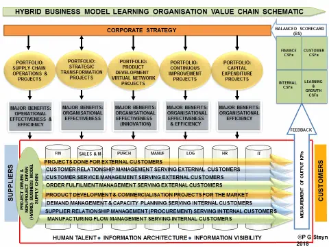 Steyn (2003, 2010, 2012, & 2013) incorporates the Figure 2 initiatives into a ‘balanced scorecard / programme management” system, governed by a Chief Portfolio Officer (CPO) at the executive level of the organization. He avers that organizations should also shape its cross-functional processes of the supply chain portfolio into a programme management structure, based on a business model of choice. As previously alluded to, an organization’s business model can be “project driven”, “non-project driven”, or “hybrid”. Figure 3 illustrates how the different programmes are shaped in a “hybrid” business model organizational structure (which has both a “project driven” and “non-project driven” component in the supply chain), based on the value chain schematic in Figure 2. Organizations operating in accordance with the “hybrid” business model do projects for external customers, and sell products and services to customers in the market place.